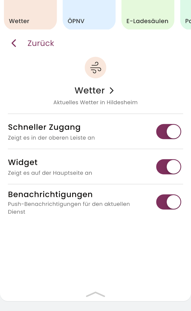 Alle Funktionen kannst Du in der App so anordnen wie es für Dich passt - das Wetter ganz oben? Oder Vielleicht doch die Infos zum Lieblingsverein? Du entscheidest und kannst auch widgest (Kacheln) löschen sowie Push-Nachrichten aktivieren - dass alles ganz ohne Login.